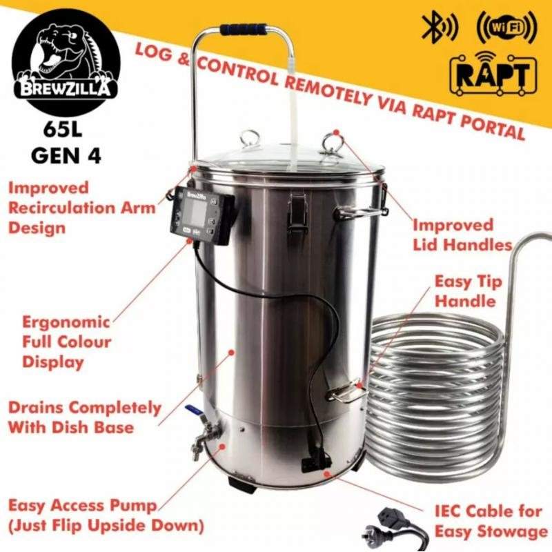 El mejor sistema todo en uno eléctrico disponible, el famoso y original brewzilla, sistema que te permite macerar, recircular, lavar granos y hacer la cocción en el mismo equipo. Incluye todas las mejoras de la GEN4 con motor de bajo voltaje integrado, panel de control para guardar los registros y setear temperatura y hacer partir la bomba (nada de botones análogos on/off), compatibilidad para bluetooth y wifi configurable para utilizar la aplicación RAPT (https://app.rapt.io/).